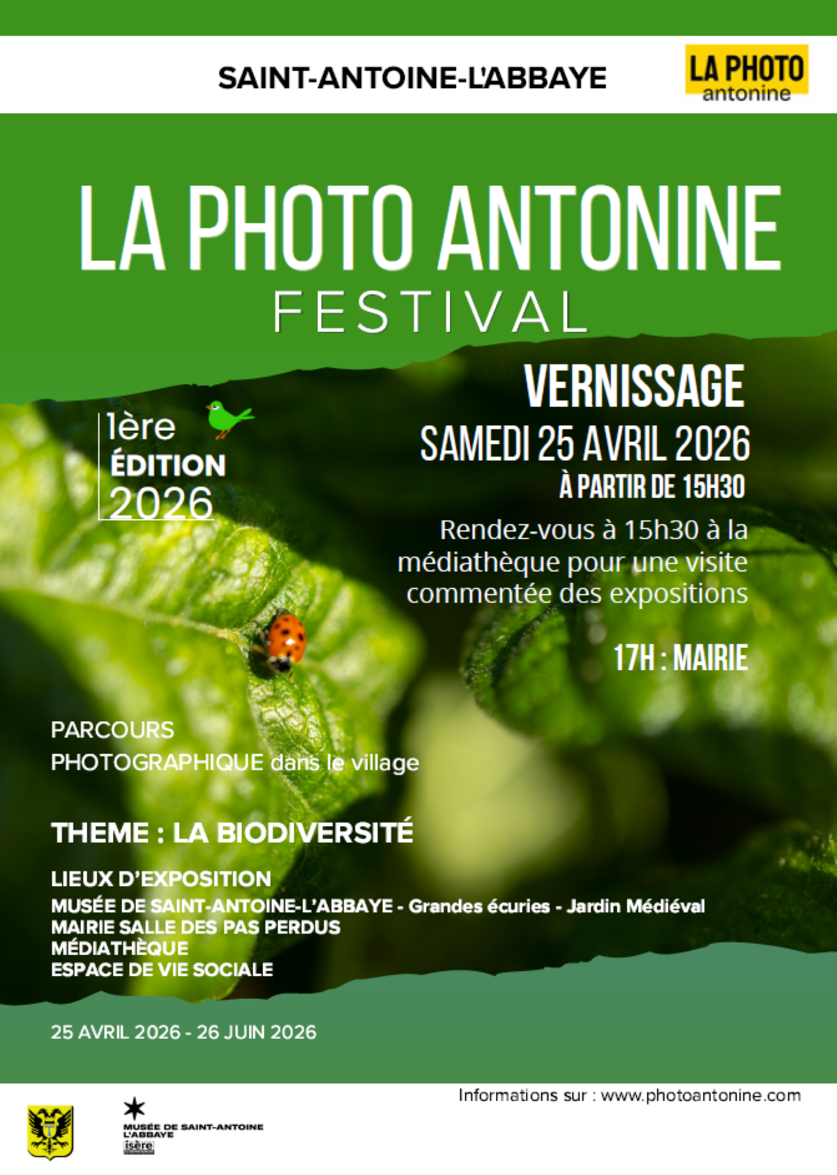 Le festival La Photo Antonine se déploie dans le village à travers plusieurs lieux culturels et patrimoniaux. Il met en avant un ensemble d'expositions photographiques autour du thème de la biodiversité, invitant à porter un regard sensible sur le vivant.