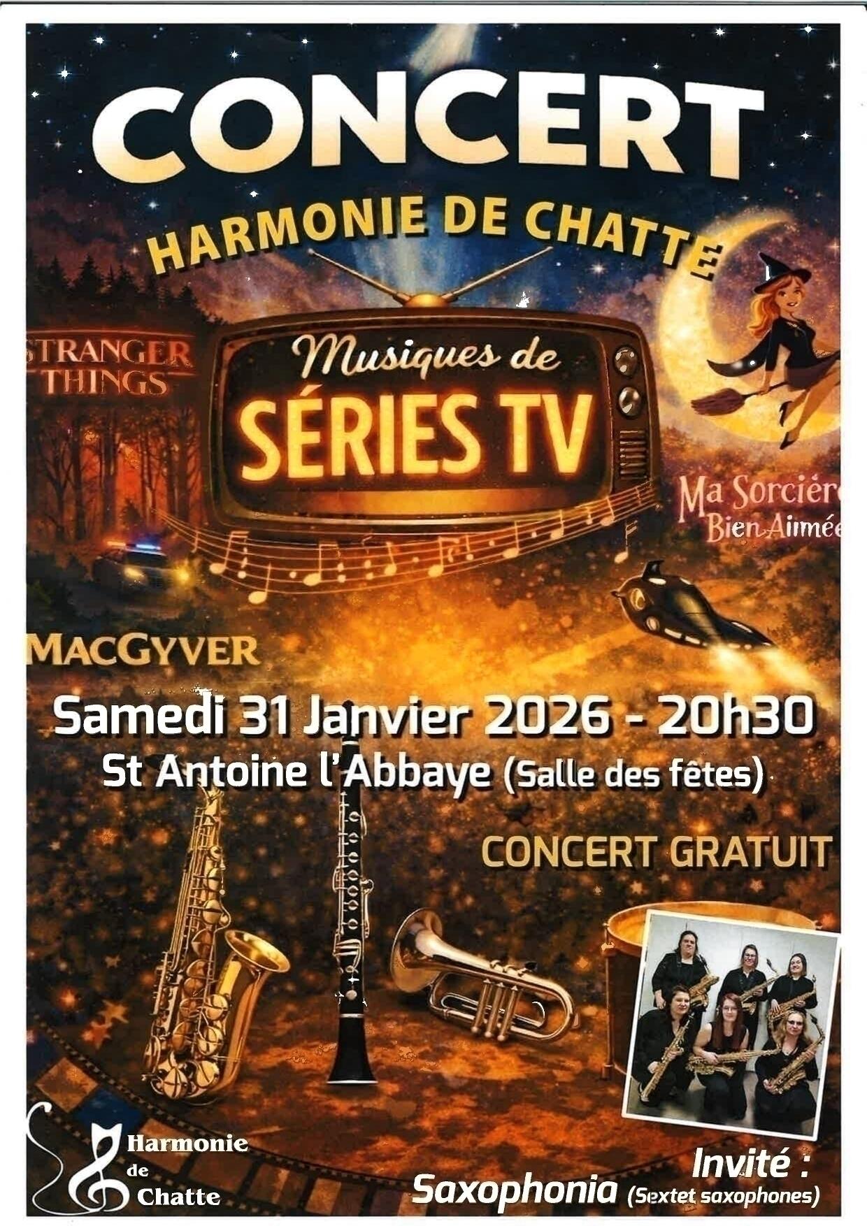 L'association Harmonie de Chatte vous invite à découvrir leur nouveau concert, mettant à l'honneur les musiques de séries TV avec comme invité de la soirée, le groupe Saxophonia !
