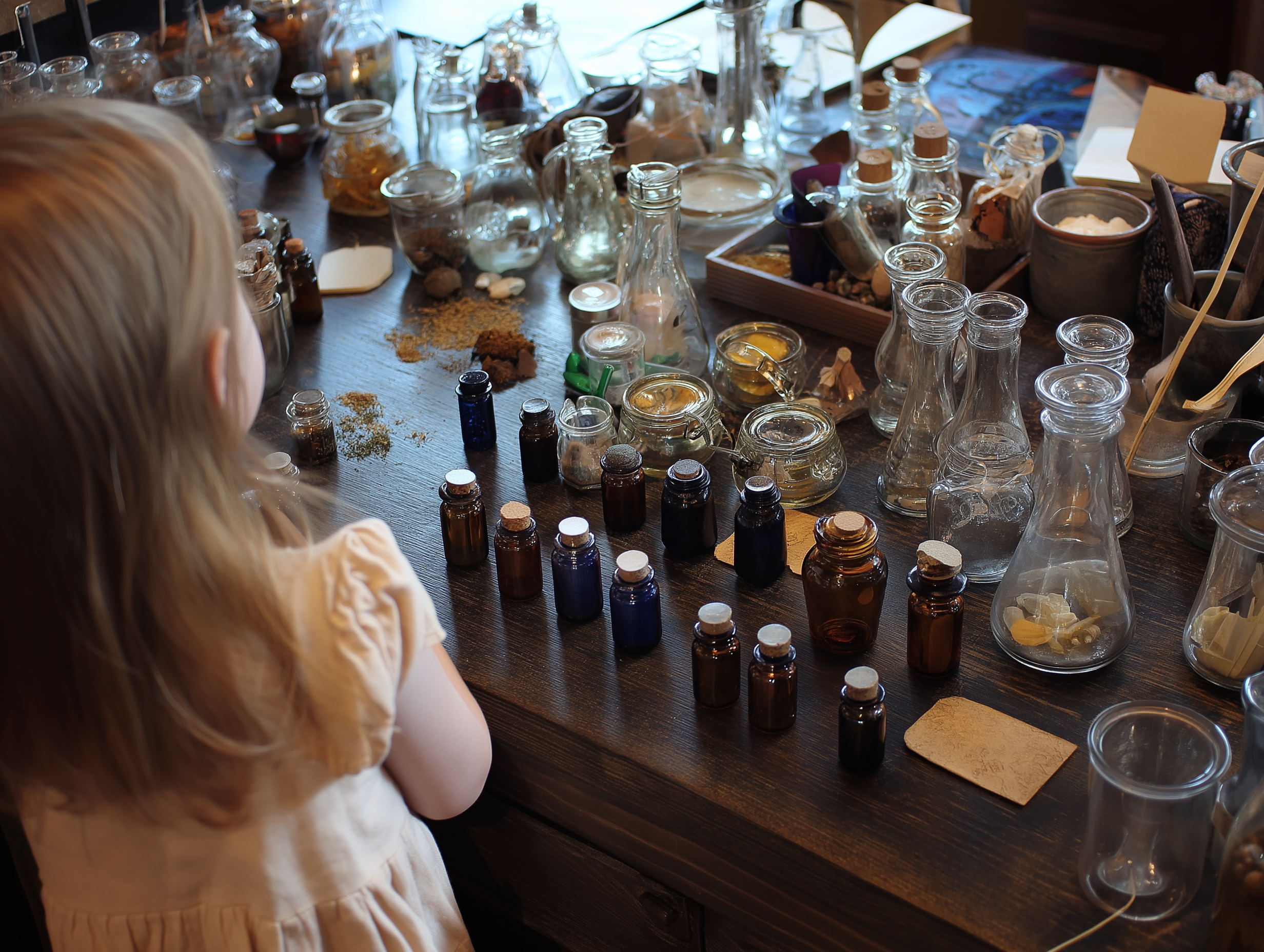 Tabliers enfilés et noms d'apothicaires choisis, les enfants découvrent les plantes : racines, écorces, feuilles, fleurs et fruits… autant de matières à sentir et raconter à travers de petites et grandes légendes. Renouant avec les gestes oubliés des officines anciennes, ils réalisent un sachet parfumé, plié et tamponné comme autrefois, à rapporter fièrement à la maison ! Une expérience interactive, sensorielle et joyeuse, qui invite à apprendre tout en s'amusant.