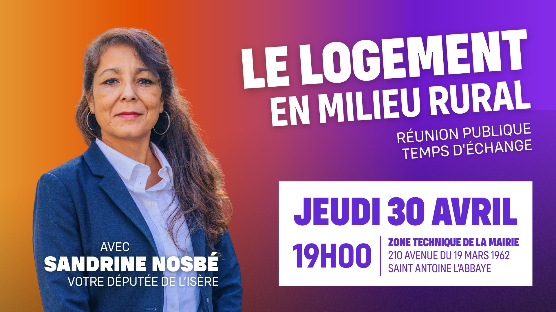 La députée de l'Isère, Sandrine Nosbé, vous invite à une réunion publique pour échanger avec elle et avec son invitée, Magali Audion, de la Maison d'accueil Arche de Saint-Antoine, partager vos expériences autour du logement en milieu rural.