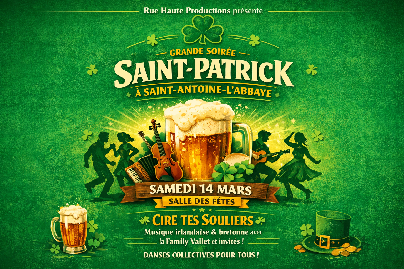 Nous vous invitons à fêter la Saint-Patrick autour de musiques et danses irlandaises et bretonnes ! Concert et Bal avec le groupe "CIRE TES SOULIERS". Buvette & restauration !