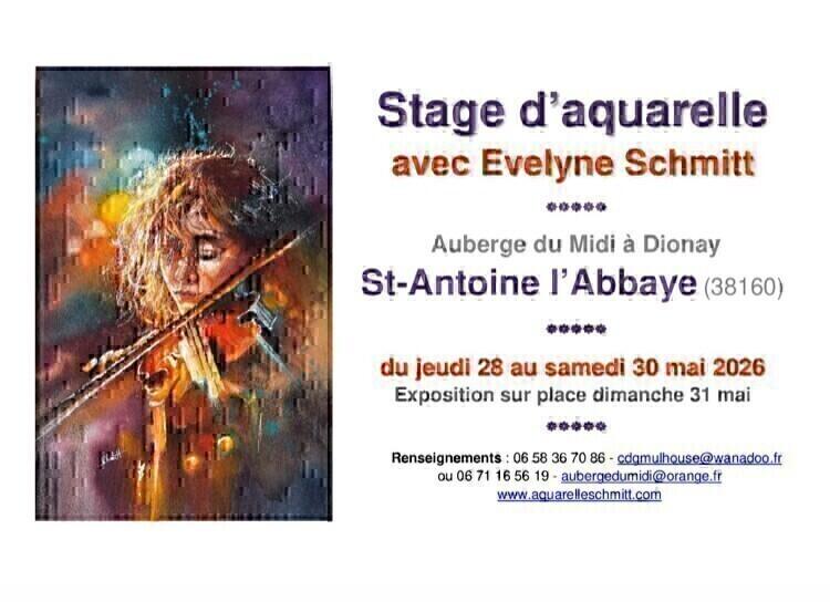 Stage d'aquarelle au sein de l'auberge du midi à Dionay. Exposition des travaux des stagiaires prévu le lendemain de la fin du stage. S'adresse aux personnes de tous les niveaux : débutants ou confirmés.